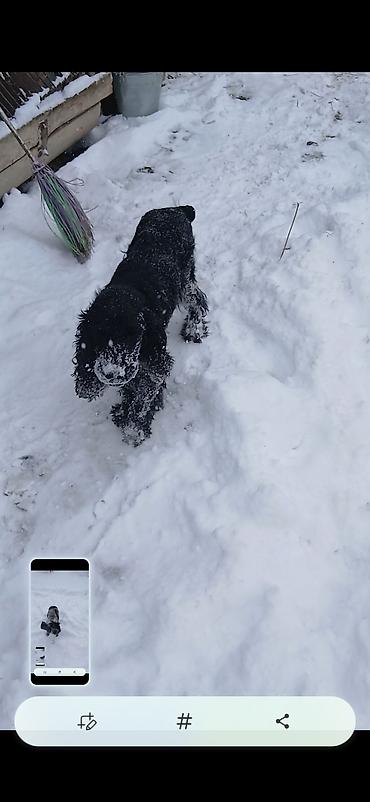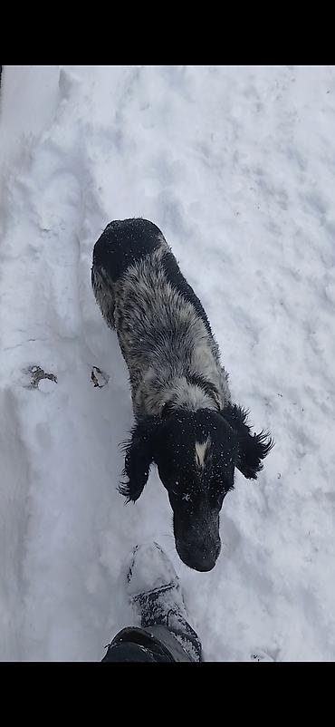 Щенок (молодая собака) средних размеров, с длинными висячими ушами и густой шерстью. Окрас пятнистый: черный с бело-серыми отметинами, морда темная, на лбу светлое пятнышко. Шерсть плотная, подходит для прогулок в холодное время; лапы опушенные. Хвост средней длины. Активная, ориентирована на человека, охотно идет на контакт, любит прогулки и игры в снегу.