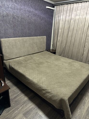 - Кровать двуспальная с мягким изголовьем нейтрального бежевого оттенка. Жёсткое основание под матрас, низкое изножье. Подходит для стандартного матраса 160×200 см (визуально — формат queen).