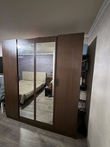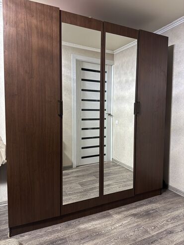 - Шкаф распашной 4‑дверный с двумя зеркальными фасадами по центру. Удобные вертикальные ручки, классический корпус. Внутри — секции для хранения одежды (отделения под вешалки и полки; симметричная компоновка).