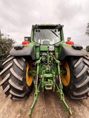 Подходит для тяжелых полевых работ, транспортных операций и работы с фронтальным/навесным оборудованием спереди и сзади. Цвет — фирменный зеленый John Deere с желтыми колесными дисками.