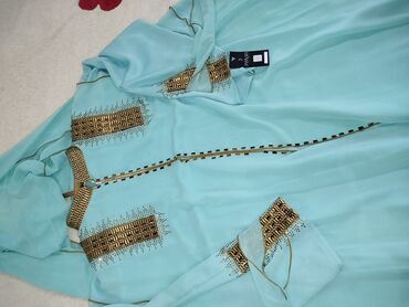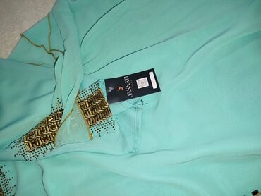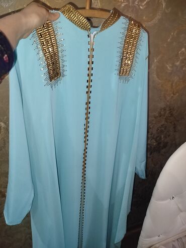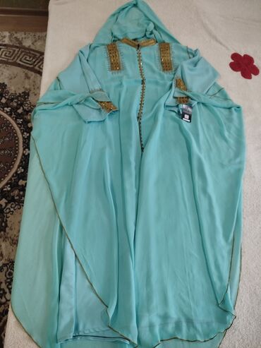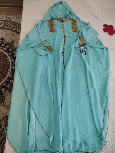 Цвет: нежный мятно-бирюзовый с золотистым декором. Стиль — восточный/вечерний, акцент на плечах и вертикальной отделке, визуально вытягивает силуэт.