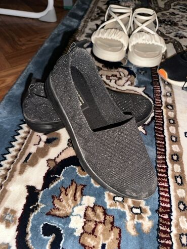 Женская обувь — два пары. 1) Белые кеды/кроссовки: - Цвет: белый - Материал верха: мягкая фактурная искусственная кожа - Подошва: светлая, утолщенная, с амортизационной вставкой в пятке - Застежка...