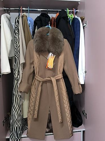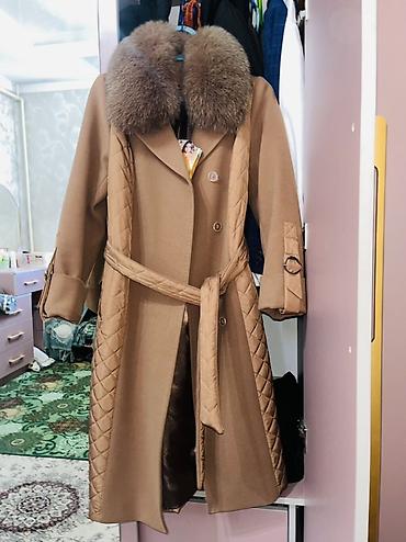 Элегантное женское пальто цвета капучино с объемным меховым воротником.