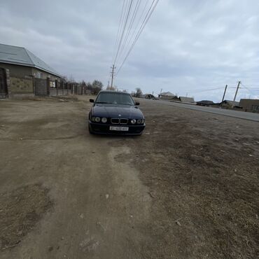 BMW 5 серии E34, седан, тёмно‑синий цвет. Классический дизайн с фирменной решёткой «двойная ноздря» и круглыми фарами. Номерные знаки KG 431 AFF на фото.