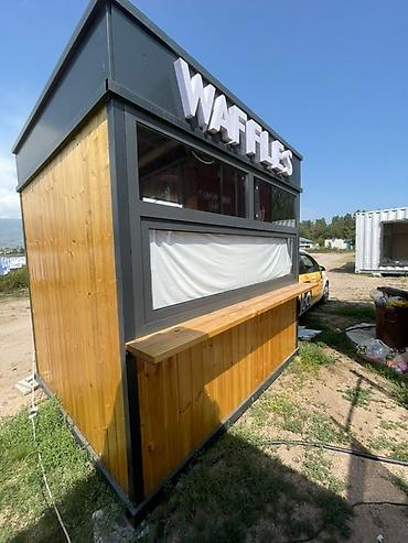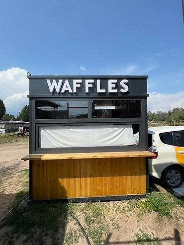 Киоск представляет собой компактное сооружение с облицовкой из светлого дерева и темного металла. Он оснащен большими окнами для обзора и обслуживания клиентов, а также удобной деревянной стойкой, идеальной для размещения товаров или обслуживания посетителей. Внутри киоска достаточно места для размещения оборудования. На крыше установлена яркая вывеска "WAFFLES" с подсветкой, что делает его заметным в любое время суток. Такая конструкция подойдет для торговой точки