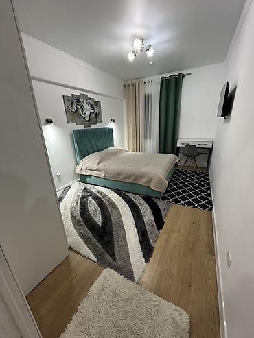 - Спальня: двуспальная кровать с мягким изголовьем, прикроватные бра, ТВ на стене, рабочий стол с стулом, плотные шторы и тюль. На полу несколько ковров для дополнительного уюта.
