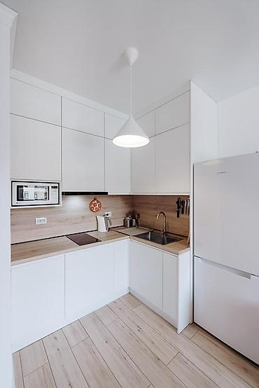 - Встроенная техника: микроволновая печь, варочная панель, вытяжка, холодильник. Есть мойка с высоким смесителем, рабочая подсветка, розетки на фартуке.