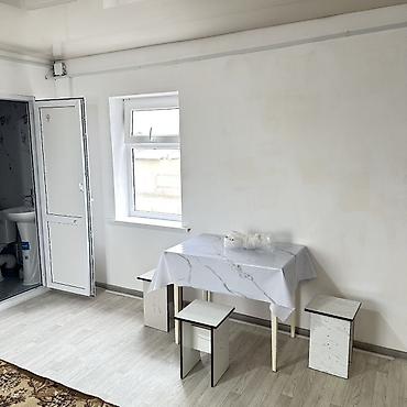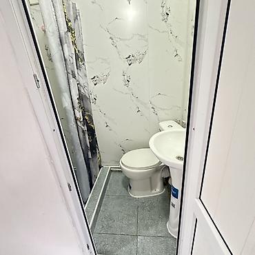 - Планировка: одна просторная комната с окном, зона кухни и отдельный санузел с душем, унитазом и раковиной.