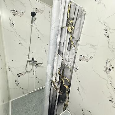 - Санузел: душевая ниша с шторкой, раковина на пьедестале, унитаз; стены с влагостойкой отделкой «под мрамор», пол — плитка.