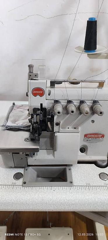 Промышленный оверлок BRUCE (4‑ниточный) с полноценной стойкой нитенаправителей и столом.