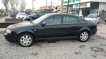 Audi A6 (C5), седан, темно‑серый/черный цвет кузова. Бензиновый двигатель 2.4 (надпись 2.4 на крышке багажника), двойной выхлоп. Кузов 4‑дверный, 5 мест. Легкосплавные диски, шины дорожного типа. Передние противотуманные фары, линзованные фары головного света, светлая оптика задних фонарей. Хромированная окантовка решетки радиатора и стекол. Зеркала и ручки кузова в цвет.