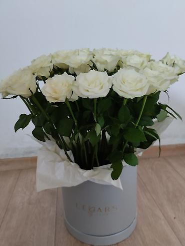 Элегантная, сдержанная и очень эффектная композиция из белых роз в коробке — готовый подарок, который не требует вазы и сразу украшает пространство.