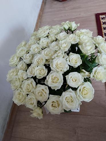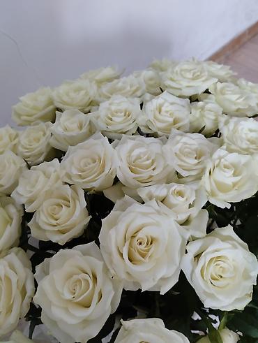 - Композиция из многочисленных белых роз классической формы с плотными бутонами.