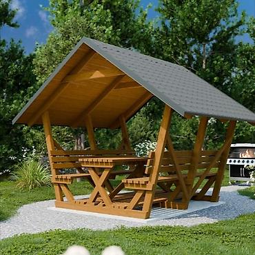 - Особенности: устойчивая база, продуманная эргономика сидений и стола, хорошая вентиляция благодаря открытым проёмам и решётчатым стенкам; легко вписывается в ландшафт.