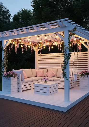 - Назначение: зона отдыха на даче, в саду, возле мангала; подходит для семейных обедов и посиделок.