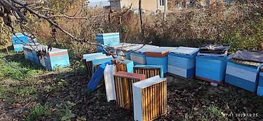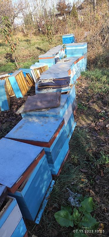 - Деревянные ульи мультиярусные (корпусные), окрашенные, с летками. На фото видно ряд комплектов одного формата — для стационарной или кочевой пасеки.
