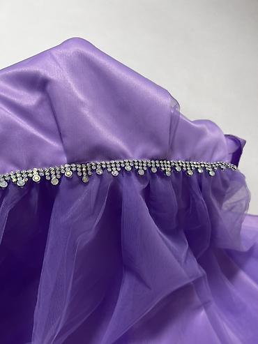Нарядное детское платье лилового цвета с пышной многослойной юбкой из фатина, украшенной декоративными бусинами. Верх платья расшит блестящими пайетками. На талии атласный пояс с большим бантом, ко...