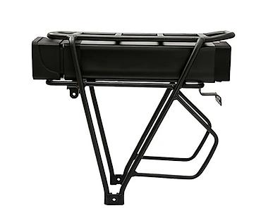 Электрический велосипед черного цвета, оснащенный багажником для удобной перевозки грузов. Модель имеет широкие шины, подходящие для различных типов дорог, и дисковые тормоза, обеспечивающие надежн...