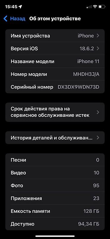 IPhone 11, 128 ГБ, черный Характеристики: - Модель: iPhone 11 (MHDH3RU/A) - Память: 128 ГБ (доступно ~100,99 ГБ) - iOS: 18.3.1 - Аккумулятор: максимальная емкость 85%, активирована «Оптимизированн...
