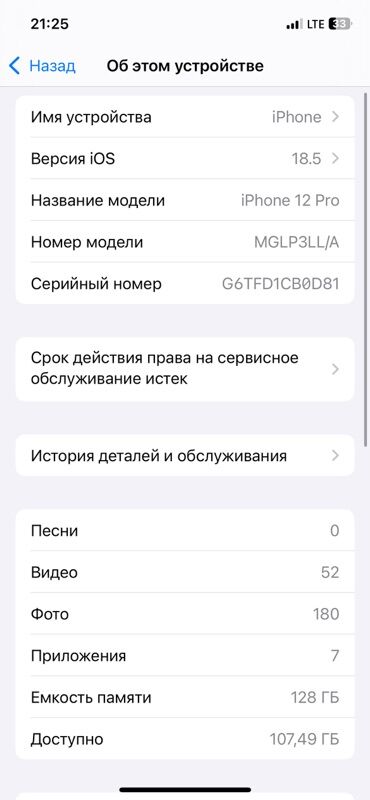 - Память: 128 ГБ, доступно ~107,49 ГБ.