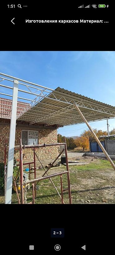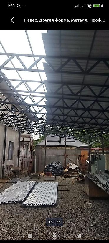 Фото показывают примеры работ: крупные пролёты на фермах, крыша из профнастила, аккуратные узлы примыкания к зданию. цена от 700 сом за м2