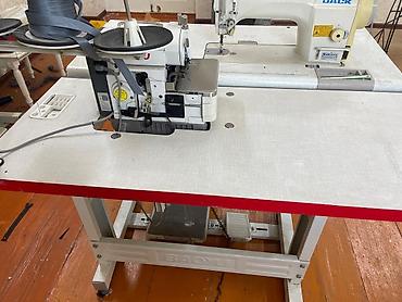 Отдельно на соседнем столе установлен промышленный окантовыватель/плоскошовный модуль (ленточный аппарат) для пришивания бейки/тесьмы, с двумя катушкодержателями и направителем ленты. Стол сварной, с педальным приводом и колесиками для перемещения.
