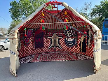 - Внутреннее оформление: орнаментальные ковры и паласы, войлочные настенные панели, национальные подвесы-суйкелдек, декоративные шкуры.