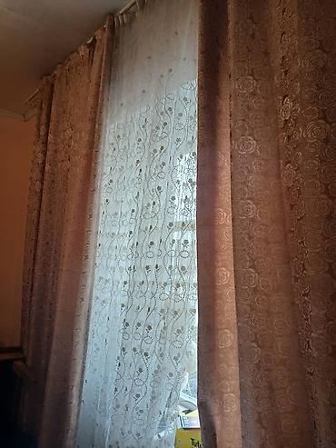 - Набор 2: портьеры теплого розово‑песочного оттенка с тиснением «розы» + кружевная тюль с цветочным рисунком.