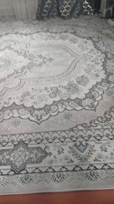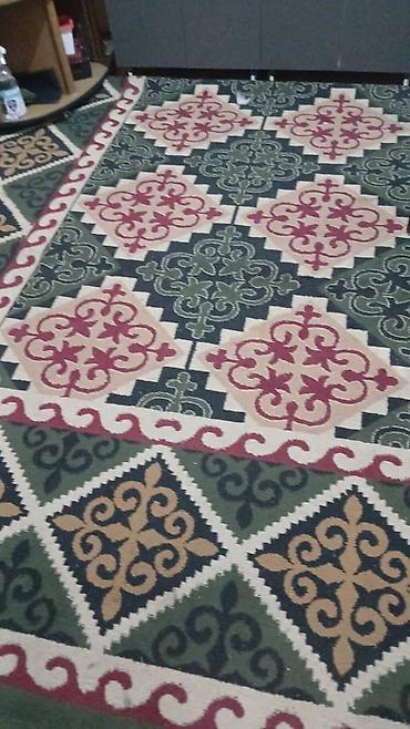 - Ковер №1: этнический орнамент. Цвета — темно‑зеленый, бежевый, бордовый и молочный; бордюр с волнообразным узором. Плотный ворс, четкий геометрический рисунок с медальонами.