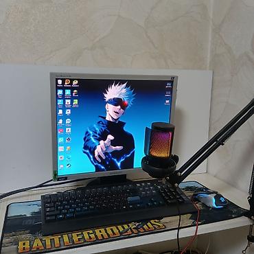 Монитор на фото — Samsung SyncMaster (19" с соотношением 5:4), подключение по VGA/DVI. На рабочем столе установлены основные программы и игры; система загружается, работает с микрофоном на рычажном креплении и игровой мышью с подсветкой (периферия на фото приведена для иллюстрации комплекта рабочего места).