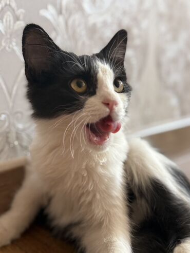 - Черно-белый котик (tuxedo): контрастная «смокинговая» расцветка, белая грудка, лапки и мордочка, длинный гибкий хвост. Ненавязчивый, любопытный, дружелюбный к людям и животным, любит совместные игры и обнимашки.