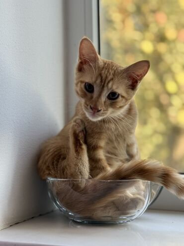 - Рыжий полосатый котик: яркий абрикосовый окрас с мраморными полосами, янтарные глаза, аккуратные стоячие ушки. Спокойный и контактный, любит сидеть рядом и урчать, хорошо ладит с другими кошками. Короткая плотная шерсть, пушистые лапки с розовыми подушечками.