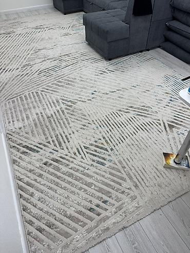 Ковёр современный, прямоугольный, светло‑серый с абстрактным геометрическим узором. Двухуровневый ворс: сочетаются более короткие петли и приподнятые мягкие участки, за счёт чего рисунок выглядит о...