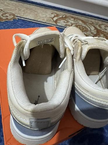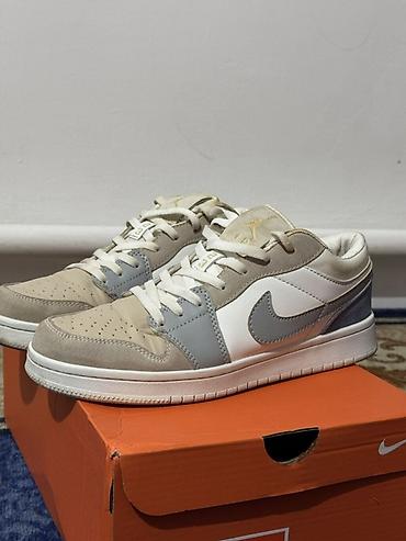 - Цветовая гамма: бежево‑серый с белыми панелями, серый Swoosh, золотистый Jumpman на язычке