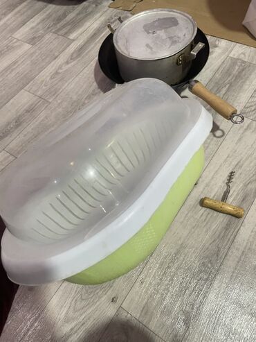 - Большой пластиковый таз/миска с решётчатой вставкой и прозрачной крышкой — удобно для мытья и сушки овощей, фруктов, зелени или как дуршлаг.
