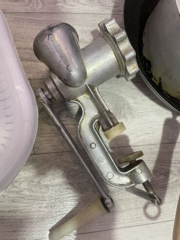 - Мясорубка ручная настольная из металла, крепление струбциной к столешнице, вращающаяся ручка, пластиковые шайбы для защиты поверхности.