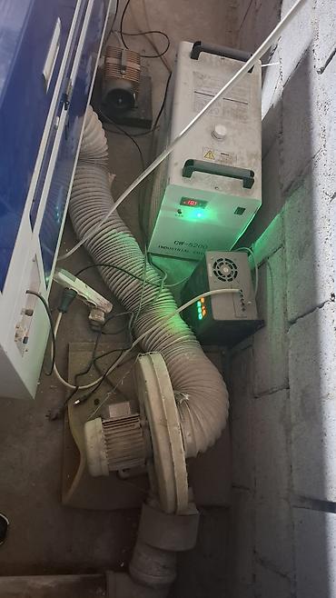 Комплектация на фото: станок, чиллер CW-5200, вытяжной вентилятор с воздуховодами, блоки питания/управления, компрессор подачи воздуха.