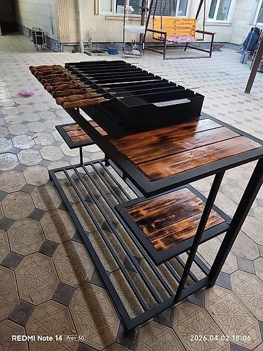 Металлические изделия для дачи и дома: мангалы и вольеры для птиц/грызунов Описание: - Стационарный мангальный стол из стали: жаровня с зубчатым краем и отверстиями под циркуляцию воздуха, площадк...