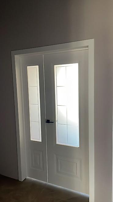 Межкомнатные двери (комплект). Описание: - Классические распашные полотна с филёнками, одно из них с остеклением (двойные окна-«косынки» в верхней части). - Материал: древесина/МДФ, окраска под сл...