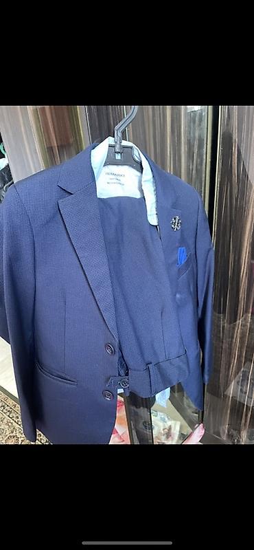 - Комплектация: пиджак, жилет, брюки. В нагрудном кармане — синяя декоративная платок-паше; на лацкане — брошь (съемная).