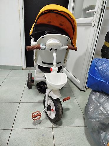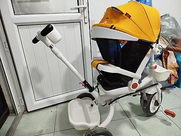 2) Трехколесный велосипед с родительской ручкой и капюшоном (желто‑белый)