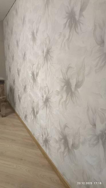 - Подготовка и выравнивание стен (шпаклевка, грунт, шлифовка), поклейка обоев: однотонные, текстурные и с крупным цветочным рисунком, аккуратная стыковка рисунка и углов.
