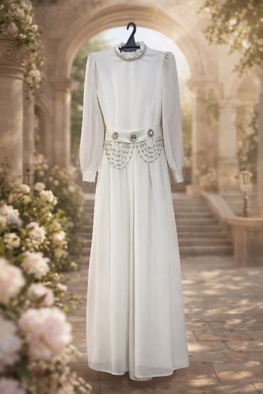 Платье в кремово-белом оттенке с жемчужным декором.