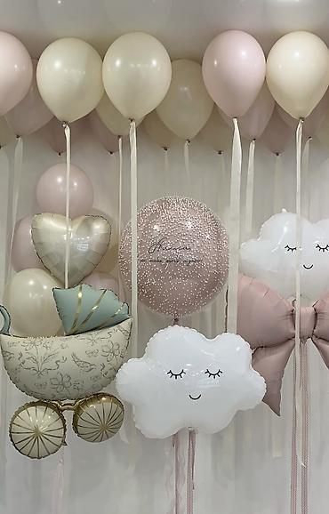 - Тематические фольгированные фигуры: облачко с личиком, объёмный бант, сердце, коляска — для выписки и детских праздников.