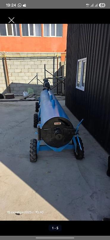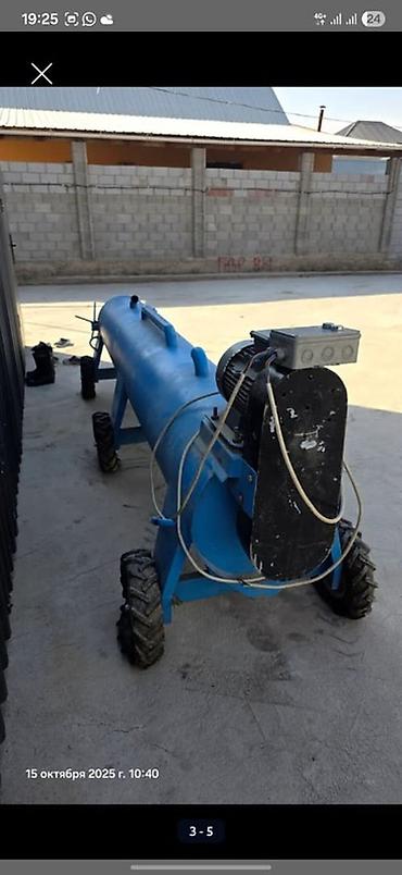 Габариты по фото: длина около 2,5–3 м, диаметр барабана порядка 45–60 см. Привод ременной/валовый, загрузка через верхний люк, выгрузка – через торцевой патрубок.