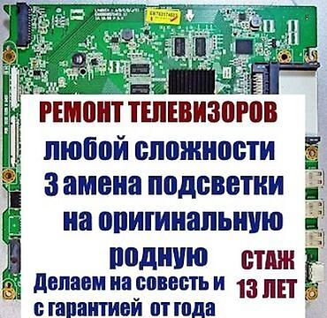 Ремонт телевизоров: жк, плазма. Замена подсветка (светодиод), гарантия 1 год, прошивка, ремонт блок питания и др. Адрес: Аламединский рынок, ТК "Строй Маркет", 2-этаж, 6-бутик. Тел: