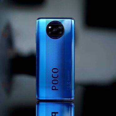 - Смартфон POCO в синем цвете с крупным логотипом на крышке. Блок камер круглый, многообъективный, со вспышкой.