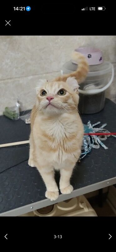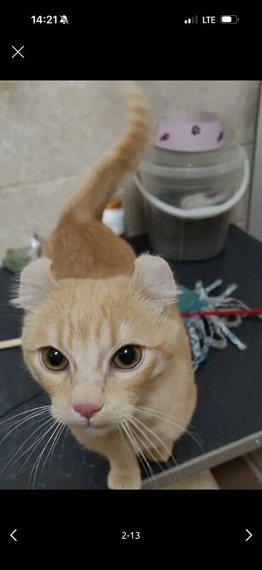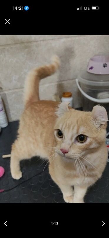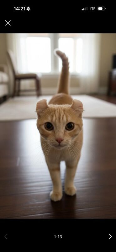 Американский керл окрас кремовый/рыжий. Кот с характерными загнутыми ушами, крупными выразительными янтарными глазами и короткой плюшевой шерстью. Компактное телосложение, толстый хвост, аккуратные белёсые отметины на груди и лапах.