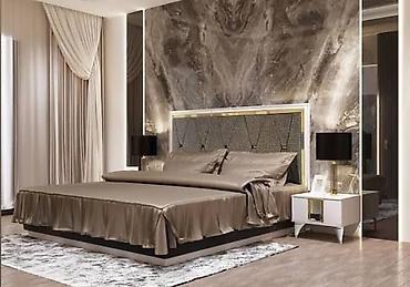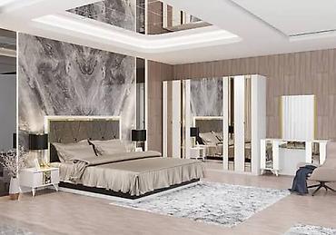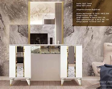 Предлагается комплект мебели для спальни, включающий шкаф, комод с зеркалом и каркас кровати. Шкаф имеет двухстворчатую конструкцию с одной секцией для вешалок и выдвижными ящиками внизу, а также в...