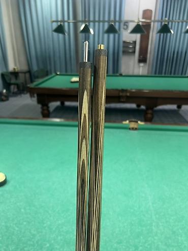 - Двухсоставной кий с резьбовым соединением металл-металл (на фотографиях видны шип и втулка).